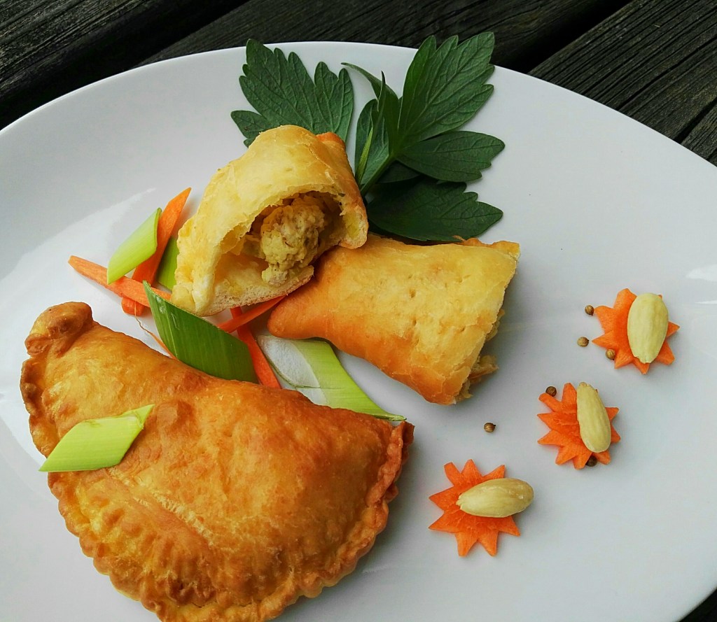 - Währenddessen der Teig ruht, kann die Fülle vorbereitet werden: Fleisch und Zwiebeln in kleine Würfel schneiden. Die Zwiebeln in etwas Öl glasig dünsten, das Fleisch hinzugeben und gut anbraten. Mit Salz, Pfeffer, Oregano, Rosmarin, Koriander und etwas Kreuzkümmel würzen. Die Mandeln in feine Stifte schneiden und beigeben. Alles gut auskühlen lassen.