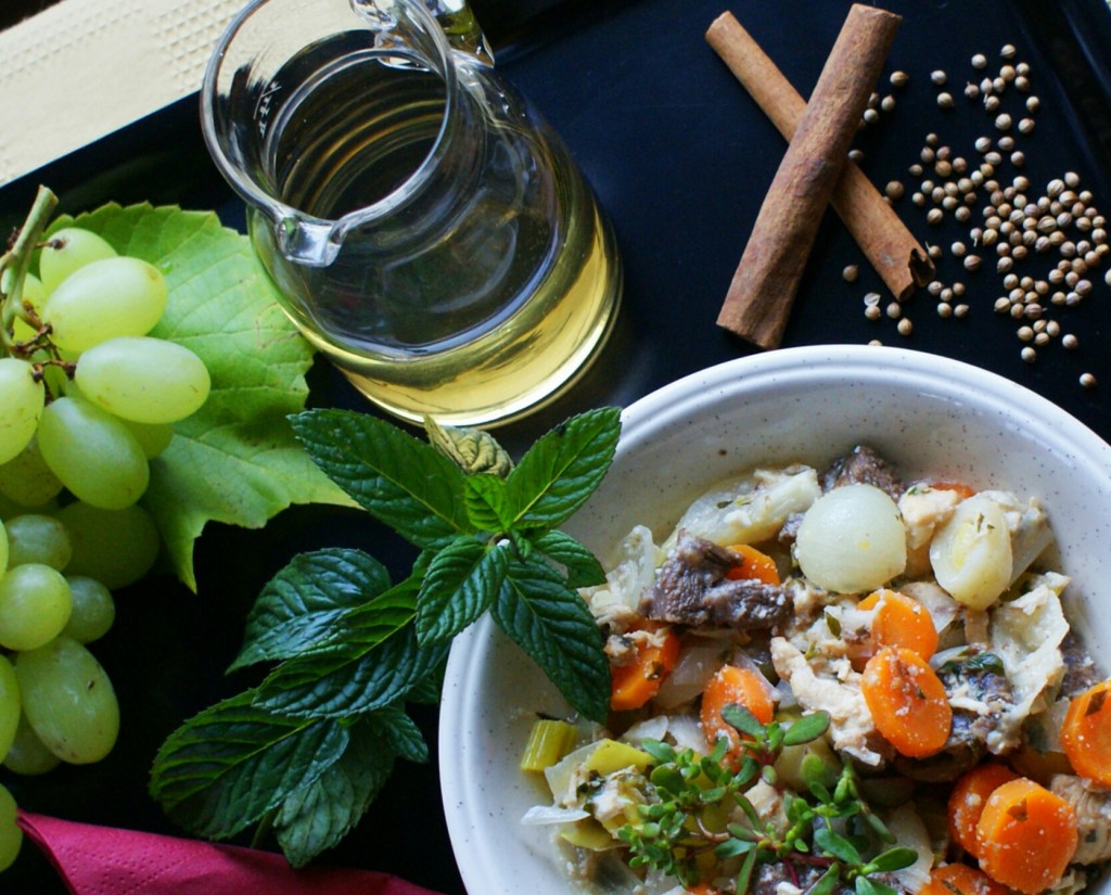 Orientalische Eintopfgerichte mit Fleisch werden immer auf dieselbe Weise zubereitet: Das in Stücke geschnittene flaisch (gemeint ist Lamm oder Rind) oder Geflügel wird in Fett angebraten, bis die austretende Flüssigkeit verdampft ist und das Fleisch sozusagen ‚im eigenen Fett sitzt‘; erst dann wird mit Wasser oder einer anderen Flüssigkeit (in unserem Fall Agrest) aufgegossen, nach und nach kommen während des Garvorgangs weitere Zutaten (Gemüse, Gewürze) hinzu.