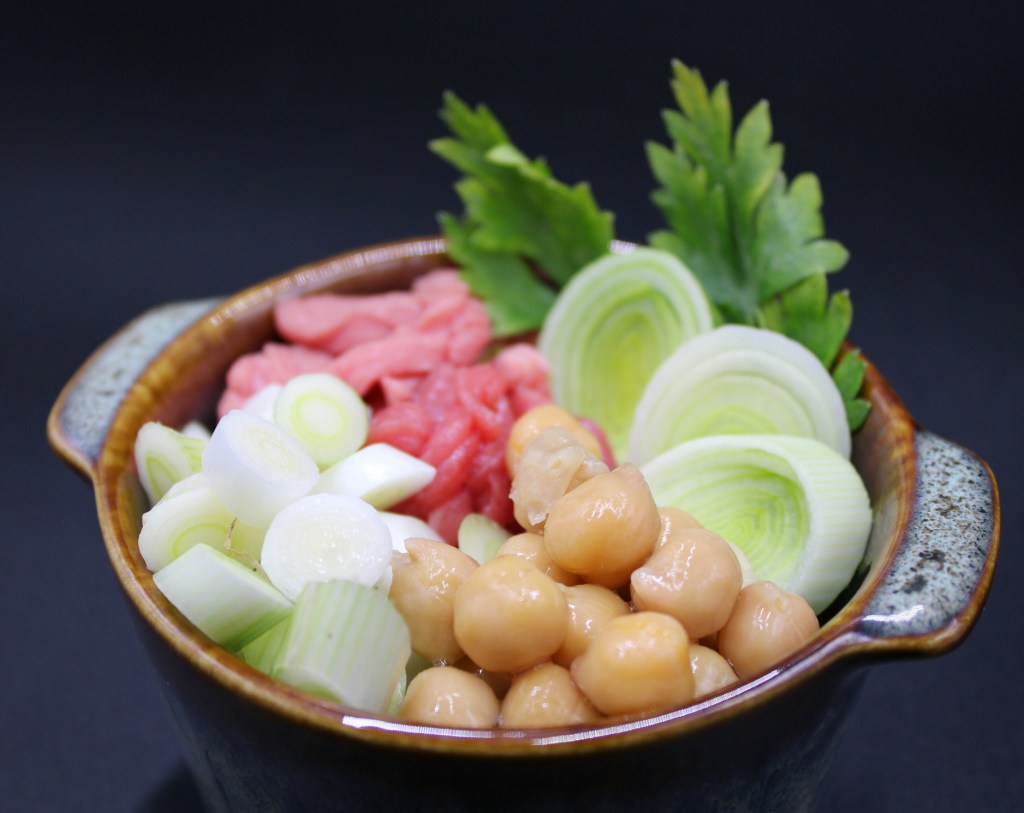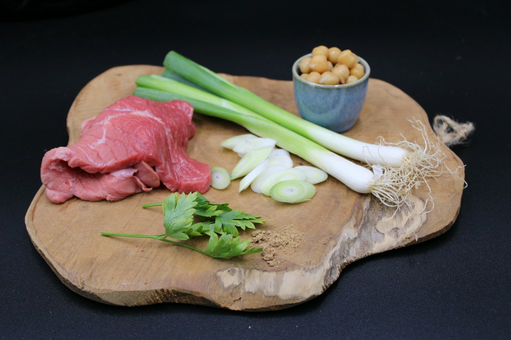 - Fleisch, Kichererbsen, Zwiebel und Lauch in einen Topf oder Wok geben, mit soviel Wasser aufgießen, dass die Zutaten gut bedeckt sind. Aufkochen und den entstehenden Schaum abschöpfen. Danach auf kleiner Flamme sanft köcheln lassen.