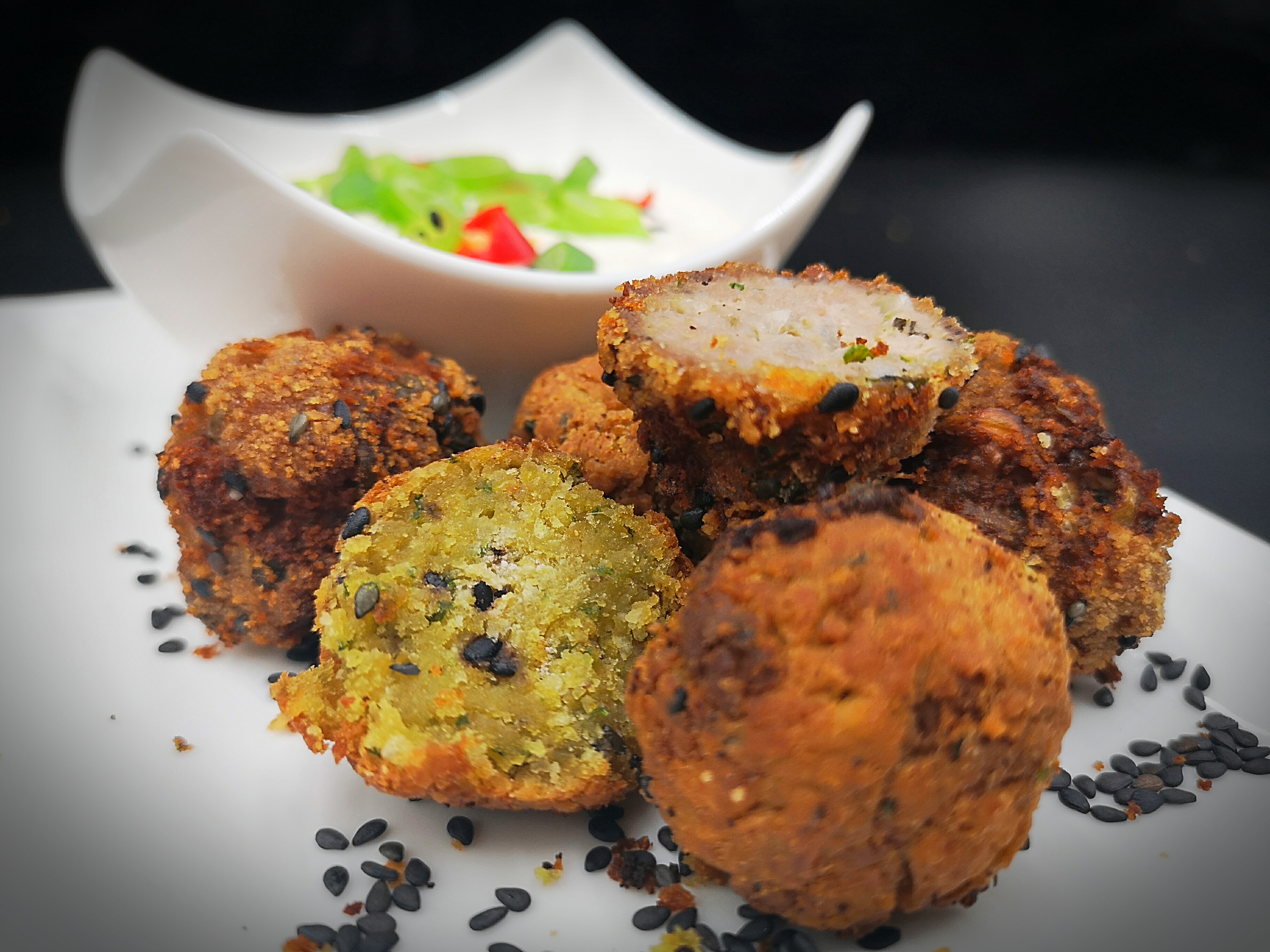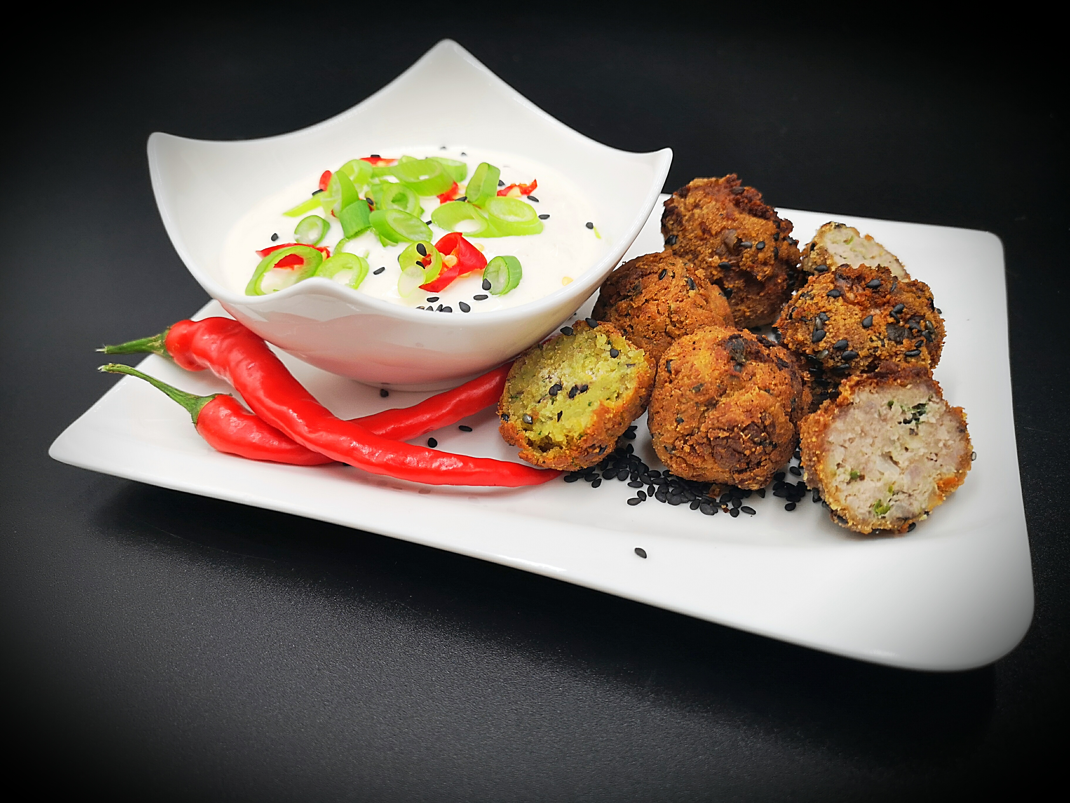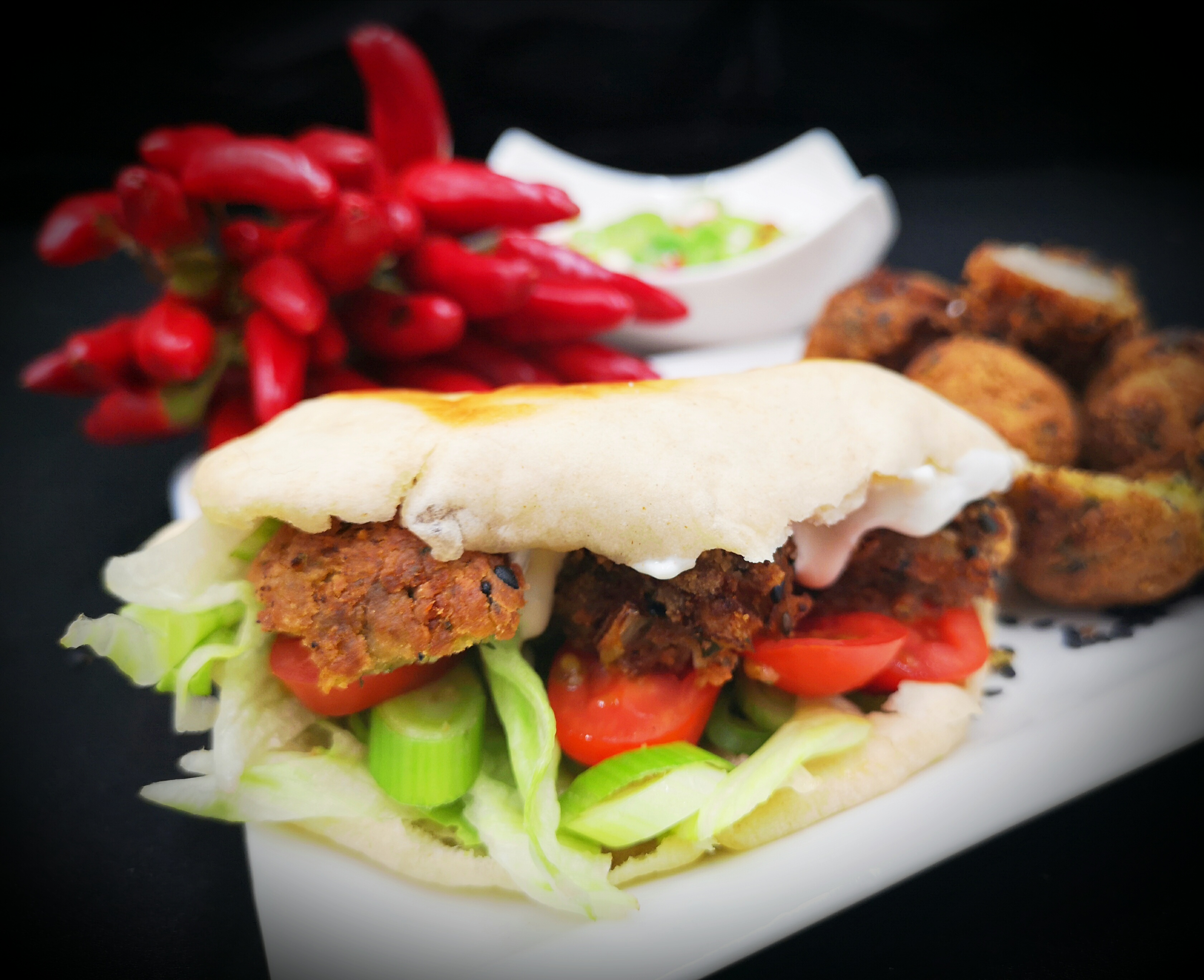 Da im Rahmen der Challenge die Zutaten auch in ein ‚modernes‘ Gericht verwandelt werden sollten, gab es Köfte (orientalisch gewürzte Fleischbällchen aus Rinderfaschiertem) und Falafel aus Kichererbsen in selbstgebackenem Pitabrot mit Joghurtsauce, Tomaten, Frühlingszwiebeln und Salat. Bei Köfte und Falafel handelt es sich natürlich auch nicht um Erfindungen unseres Jahrhunderts: Beide Gerichte stammen ursprünglich aus dem arabischen Raum, wo sie eine lange Tradition haben und sind früh auch in der mediterranen und osteuropäischen Küche bezeugt. Den mitteleuropäischen Raum eroberten sie allerdings erst ab den 1980er Jahren, als die ersten Dönerbuden eröffneten und sie als Alternative zum klassischen Döner-Kebab anboten.