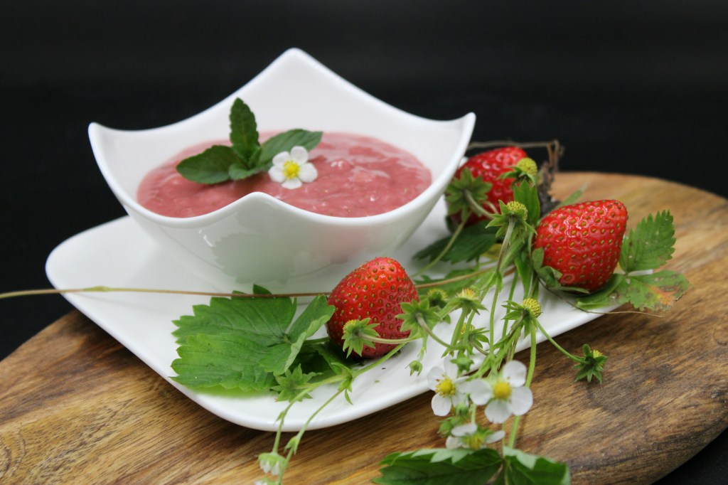 Erdbeeren mit zerkleinertem Weißbrot und einem Schuss Wasser pürieren. Mit Rotwein, Essig und Honig aufkochen und auf schwacher Flamme ca. 10 min köcheln lassen, bis das Mus leicht eingedickt ist. Gegebenenfalls mit zusätzlichem Honig, Essig oder Wein abschmecken. Vom Herd nehmen, mit Ingwerpulver würzen und kräftig pfeffern, gut durchrühren. Lauwarm oder gekühlt servieren.
