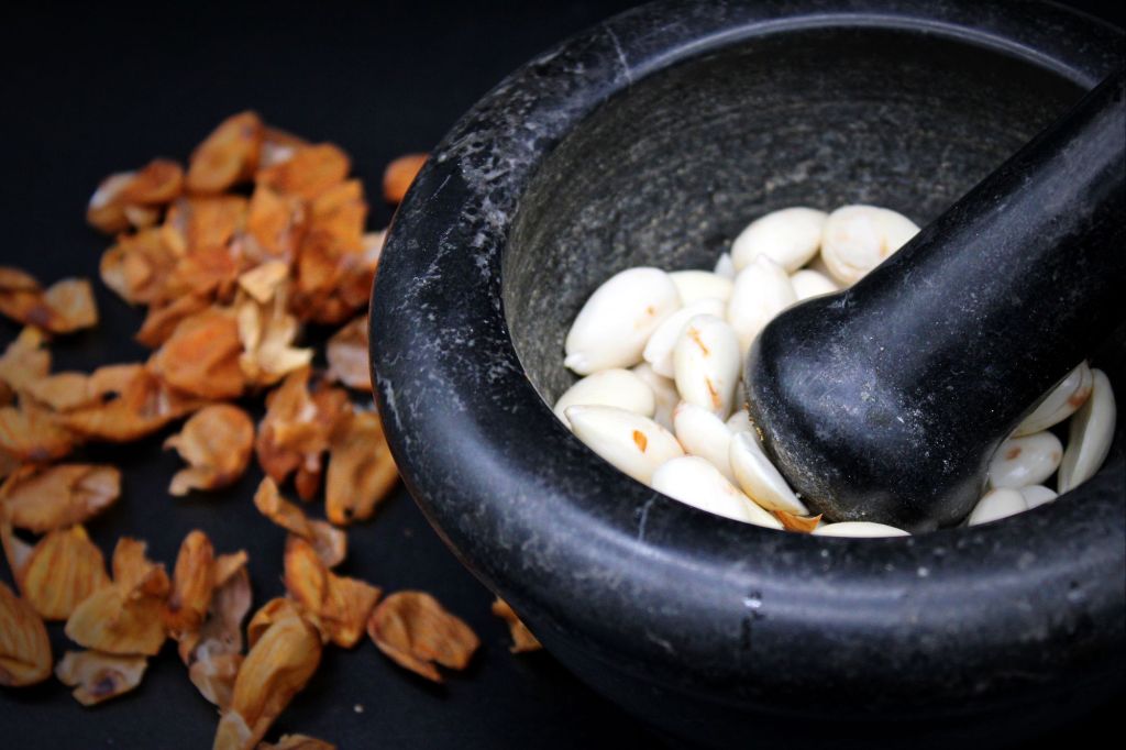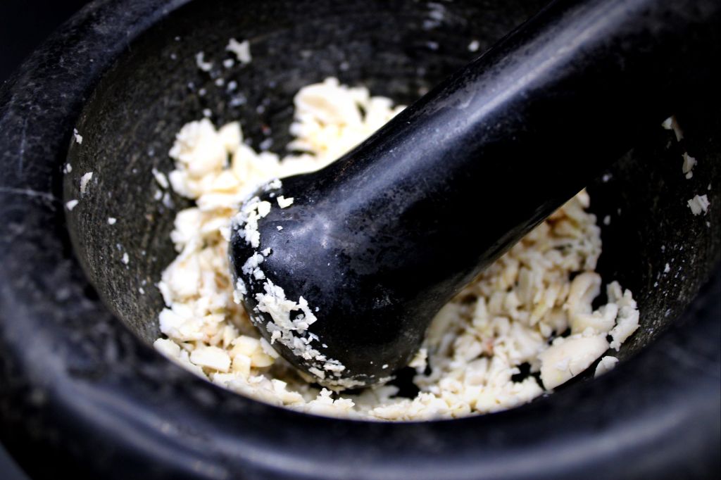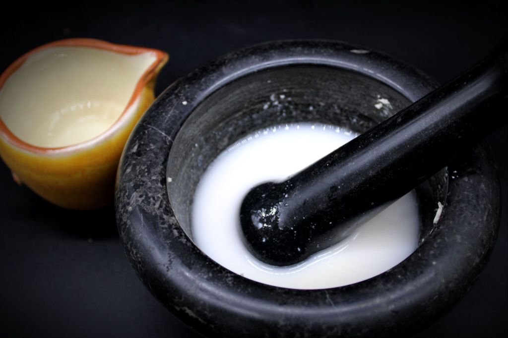 Mit 250ml Wasser pürieren oder mörsern, bis ein feiner, weißer Brei entsteht.