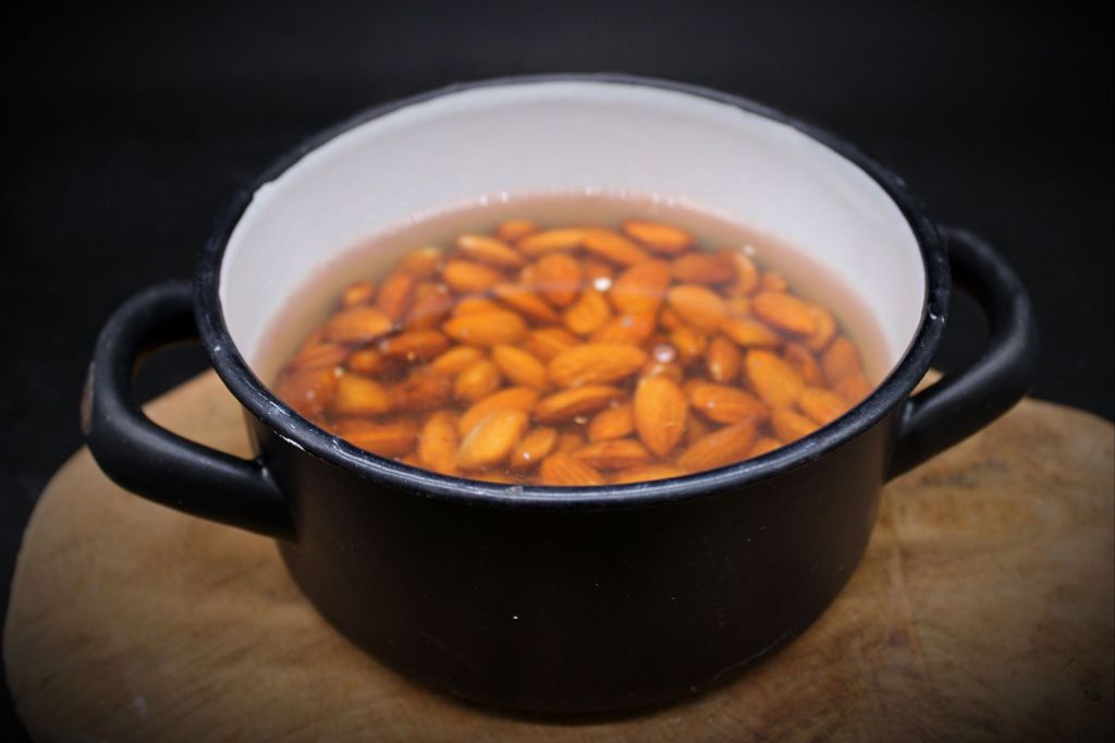Mandeln in einen Topf geben, mit heißem/kochenden Wasser übergießen und min. 30 Minuten einweichen lassen.